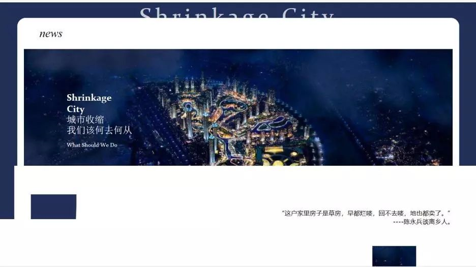 该作品以一段收缩型城市迁居者的自述展开,全文采用“华尔街日报体”写作。第一部分呈现宏观层面的中国收缩型城市问题全貌,通过人口密度、城市面积两个维度的变化展示城市收缩问题的严重性;第二部分以龙瀛学者的研究发现引出城市收缩的原因,对六个代表城市GDP与产业结构三年来的数据进行可视化呈现,并以典型案例来分析收缩型城市经济发展趋势。第三部分通过改革开放40年来城镇化相关政策数量与侧重点的变化,展示中国城镇化各个阶段所面临的不同问题,以此阐释中国城镇化进程的历史沿革。面对收缩型城市这一城市发展过程中的新阶段与新问题,作品引用梁启东副院长对收缩型城市未来发展导向建议以及受访者个人经历结束。