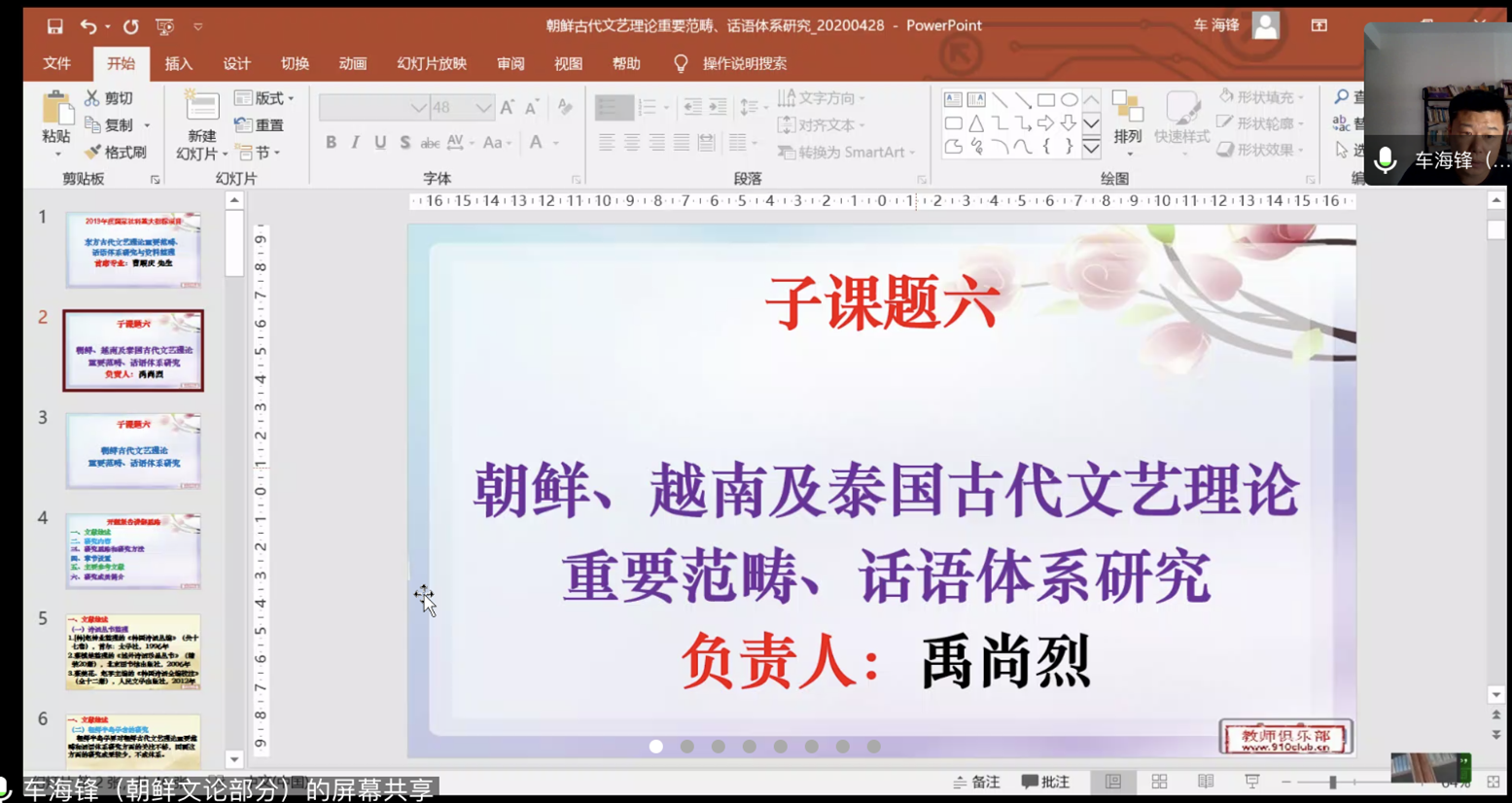 车海锋副教授从文献综述、研究内容、研究思路与方法、章节设置、主要参考文献、研究成员简介六个方面就禹尚烈教授负责的子课题六“朝鲜、越南、泰国古代文艺理论重要范畴、话语体系研究”进行线上视频汇报。