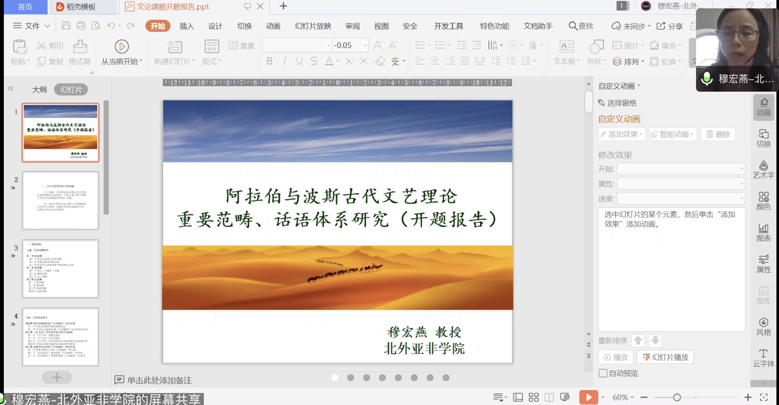 穆宏燕教授从子课题研究主要问题、框架结构、研究思路、研究方法、课题成员五个方面就其负责的子课题四“阿拉伯与波斯古代文艺理论重要范畴、话语体系研究”进行线上视频汇报。