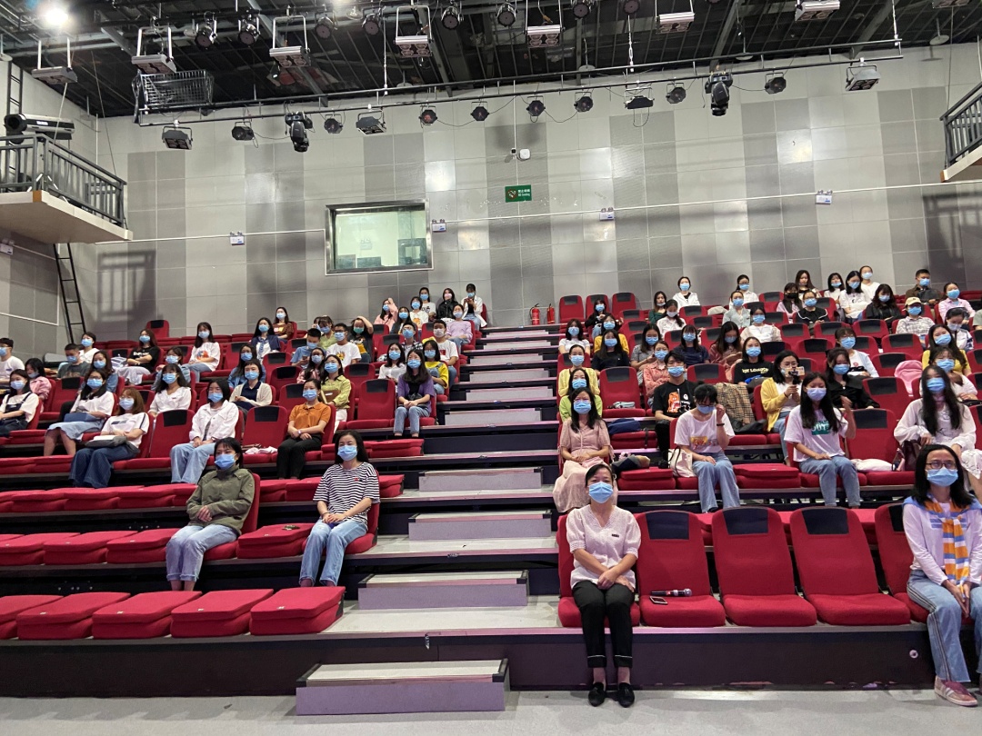 我院新生在江安校区文科楼一区演播厅同步收看现场转播。