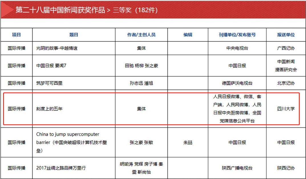 自2016年起担任试点报送单位以来,我院初评推评的作品多次荣获中国新闻奖。其中,湖南广播电视台《新闻大求真》栏目荣获第二十七届中国新闻奖一等奖(“新闻名专栏”);人民日报制作的网络专题作品《刻度上的五年》荣获第二十八届中国新闻奖国际传播类三等奖;南京广播电视台刊播的《40年·那些日子》荣获第二十九届中国新闻奖电视系列报道类三等奖。这体现了我院中国新闻奖初评委员会专家们精准的新闻判断和题材把控能力。