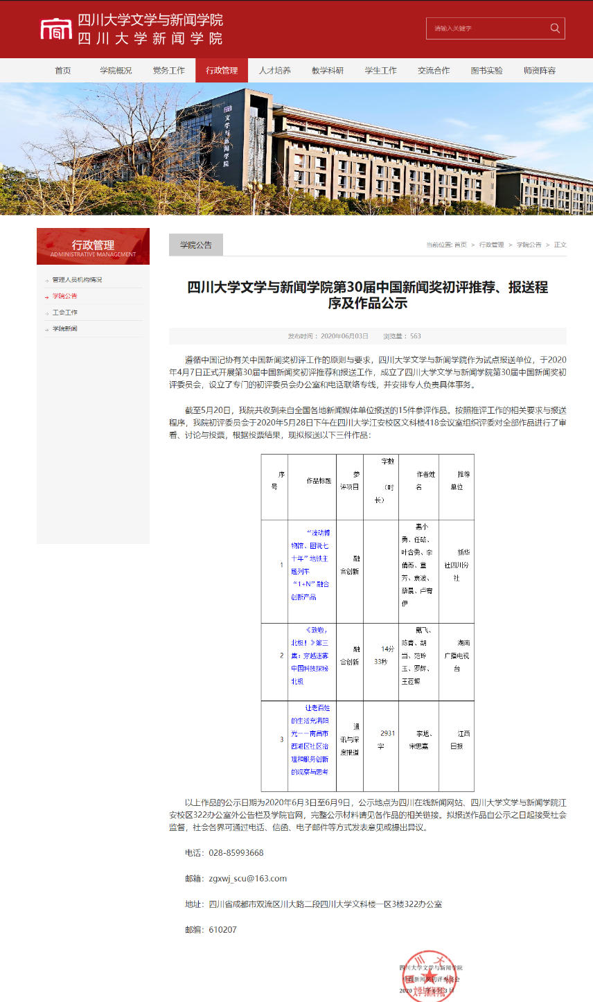 遵循中国记协有关中国新闻奖初评工作的原则与要求,我院于2020年4月7日正式开展第30届中国新闻奖初评推荐和报送工作,成立了英国上市公司365文学与新闻学院第30届中国新闻奖初评委员会,设立了专门的初评委员会办公室和电话联络专线,并安排专人负责具体事务。