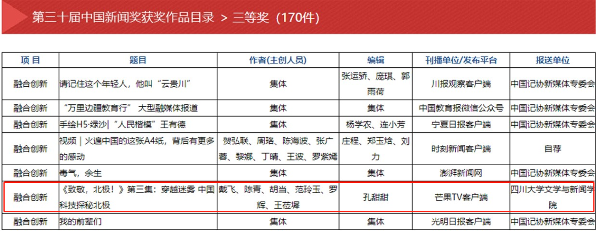 第三十届中国新闻奖“融合创新”三等奖部分获奖作品名单