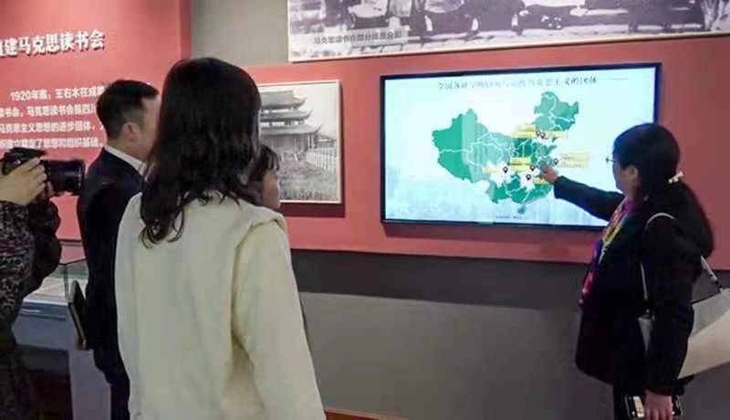 参访过程中,我院师生不时驻足,俯身靠近展柜内的文物仔细阅看,一字一句地品读着每一张老照片背后的故事。其中一块电子展板尤其惹人注目,上面勾勒着马克思读书会的创办始末,并以地图呈现出全国早期马克思主义的研究与传播情况,这引发了参访师生的关注与思索。我院副院长操慧教授说,中国这些最早燃起马克思之光的地方,往往与丰富的报业实践活动伴生,其背后所折射的新闻与历史的互构关系以及新闻对进步思想的启蒙作用值得我们深入研究。