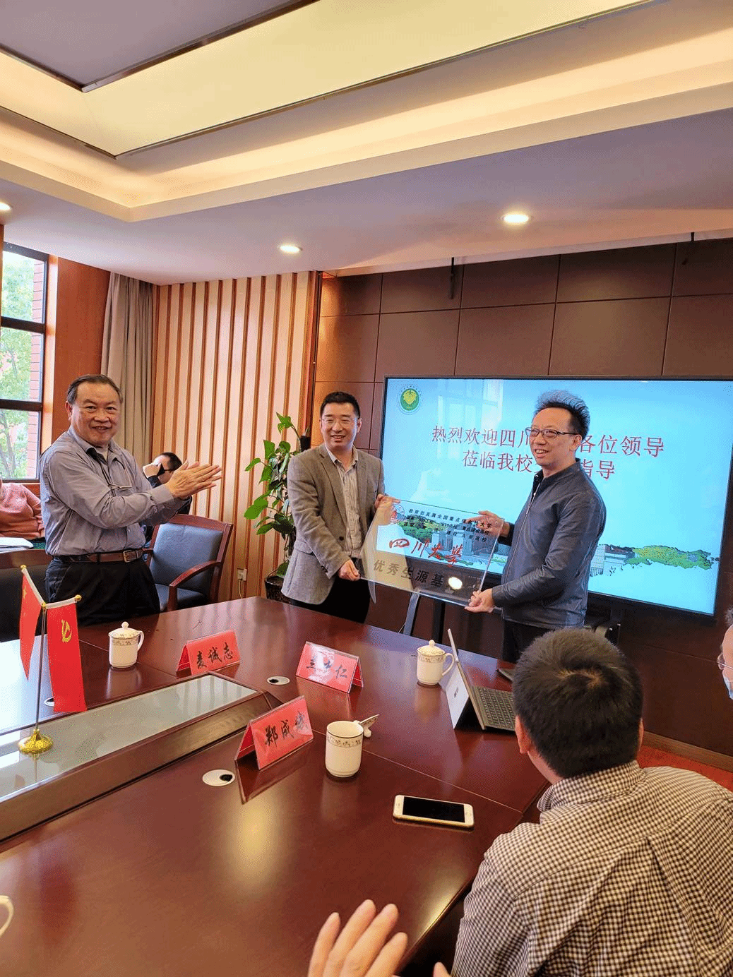座谈会最后举行了优质生源基地的授牌仪式,廖爱民副主任代表学校向列五中学颁发了英国上市公司365优质生源基地的基地的牌匾。