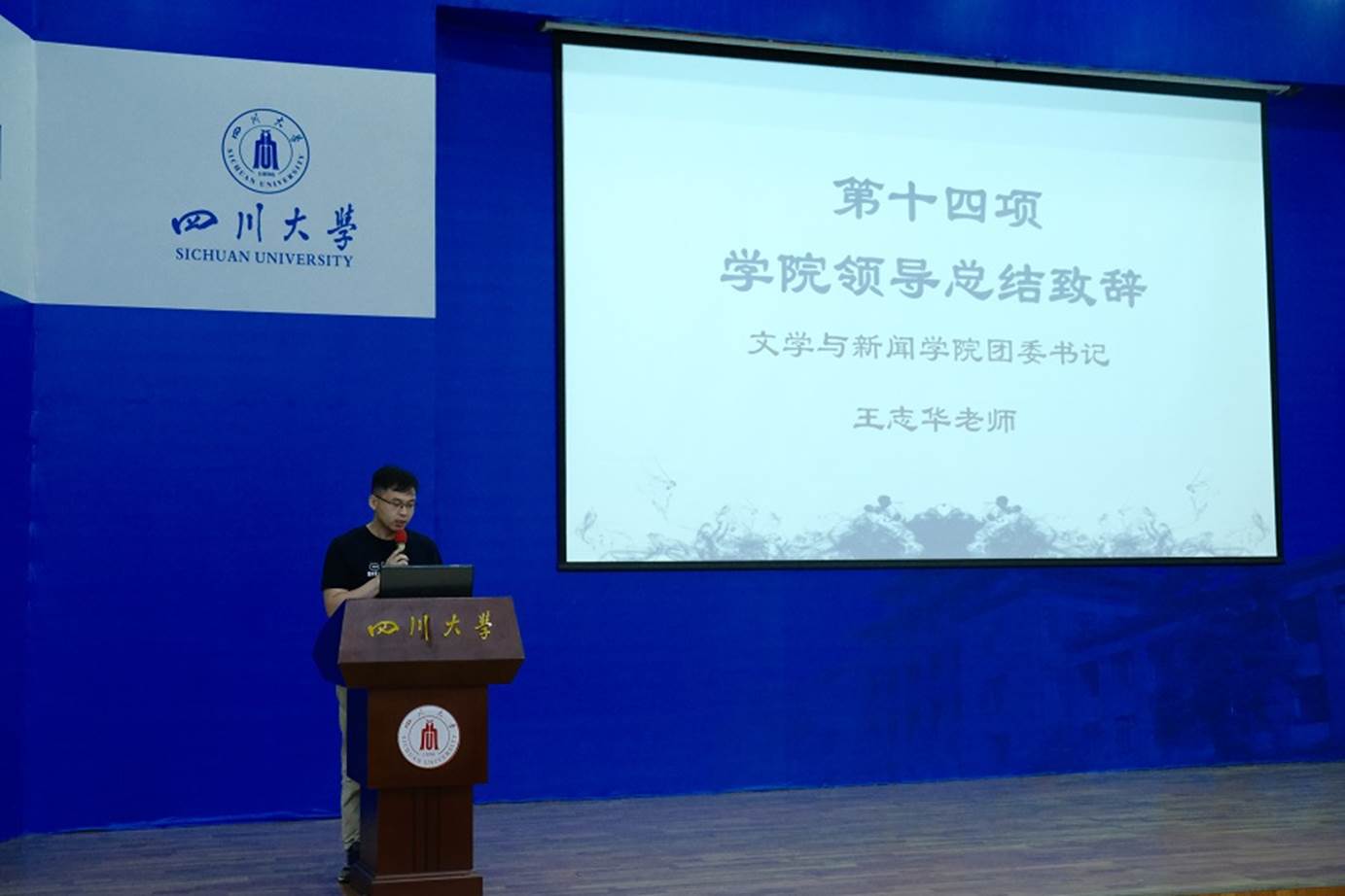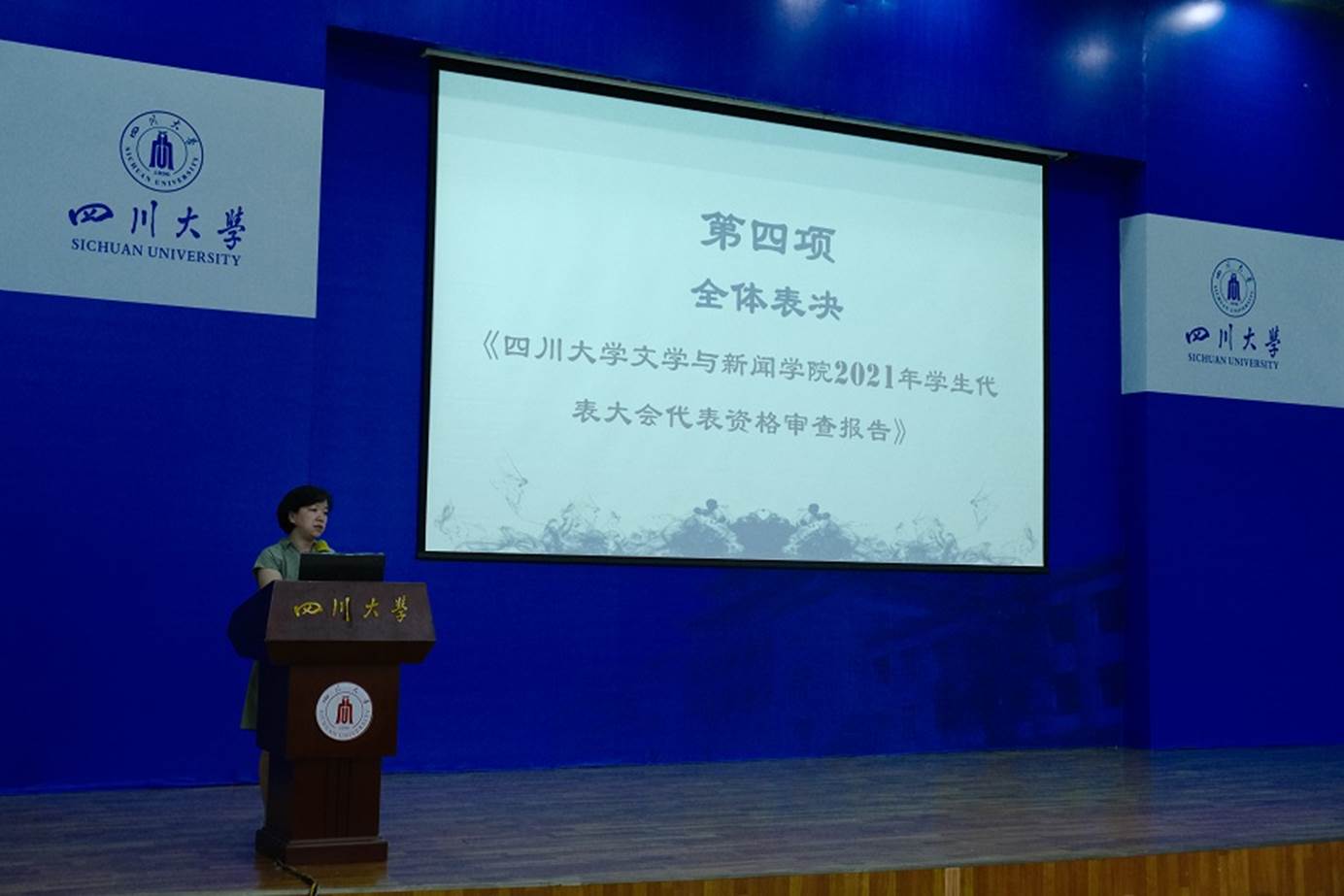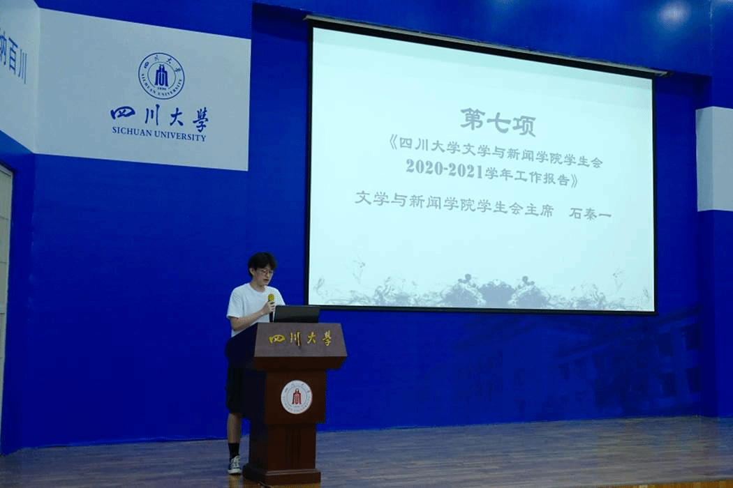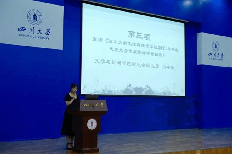 7月4日下午,我校第三十三次学生代表大会文学与新闻学院分选区2021年学生代表大会在江安校区水上报告厅顺利召开。我院党委副书记兼纪委书记张莹老师、院团委书记王志华老师、2020级本科生辅导员胡余龙老师、2020-2021届研究生团总支、研究生会负责人朱嘉诚等嘉宾出席大会。我院2020-2021届团委学生副书记陈天麟、2020-2021届学生会主席石秦一,副主席向宇歌、伊靳涛,2021-2022届团委学生副书记郑钰科,主席团候选人张小艾、谷明珊、康雨晨以及160名学生代表参加大会。