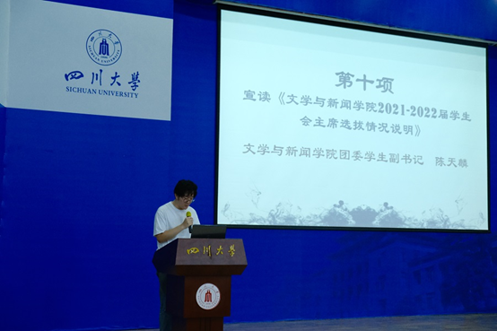 我院2020-2021届团委学生副书记陈天麟宣读学院学生会主席选拔情况说明