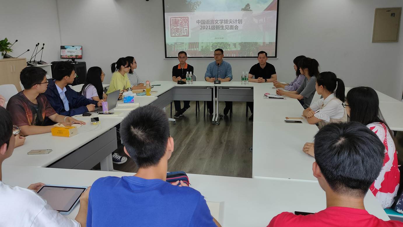 2021年9月30日下午2:30,我院于文科楼一区锦江书院举行中国语言文学拔尖计划2021级新生见面会。中国语言文学拔尖计划执行主任、文学与新闻学院副院长周维东教授,2021级中国语言文学拔尖计划班主任吕东老师,中国语言文学拔尖计划项目秘书刘天泉老师参加见面会,本次见面会由周维东教授主持。