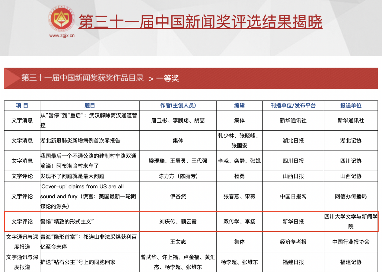 2021年11月7日,中华全国新闻工作者协会主办的第三十一届中国新闻奖评选结果揭晓,四川大学文学与新闻学院报送的新华日报作品《警惕“精致的形式主义”》喜获第三十一届中国新闻奖一等奖,是此届中国新闻奖一等奖中仅有的三篇文字评论之一。这是自2016年起担任试点报送单位以来,我院初评推评的作品第五次荣获中国新闻奖。