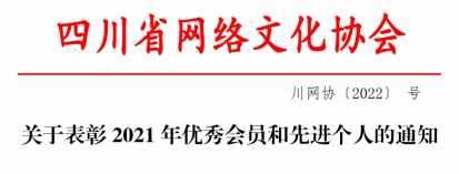 为表彰先进、树立典型,四川省网络文化协会近日发布2022年第1号文件,表彰了“十佳杰出会员”、19家年度优秀会员单位和15名先进个人。我院获四川省网络文化协会2021年度“十佳杰出会员”称号。这是我院获得“四川省网络文化协会2020年度优秀会员称号”后,第二次荣获年度十佳杰出会员荣誉称号。