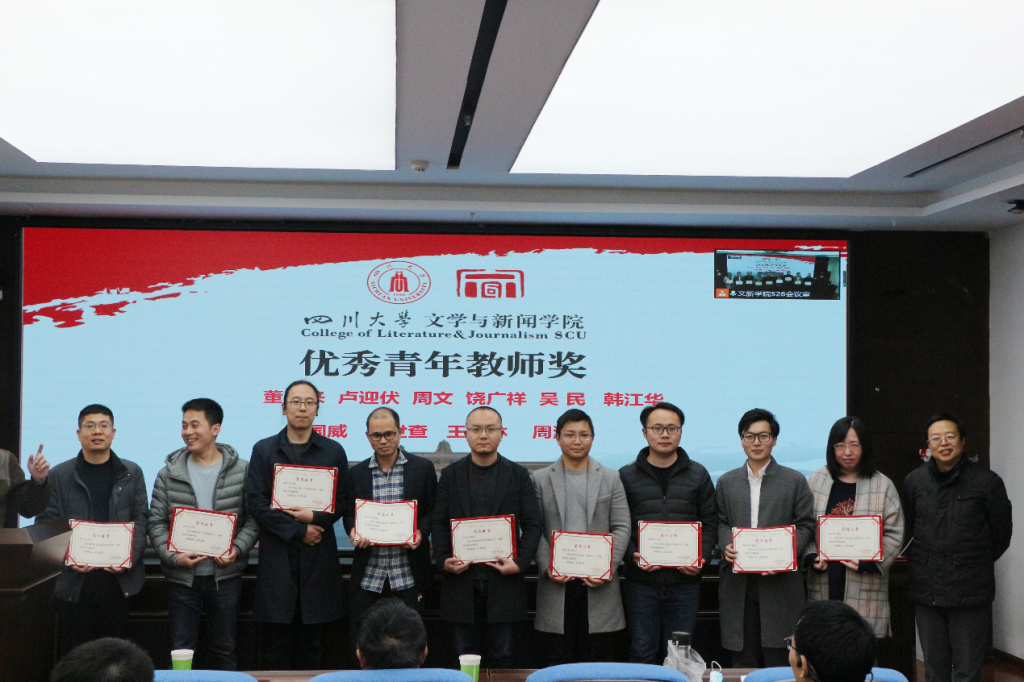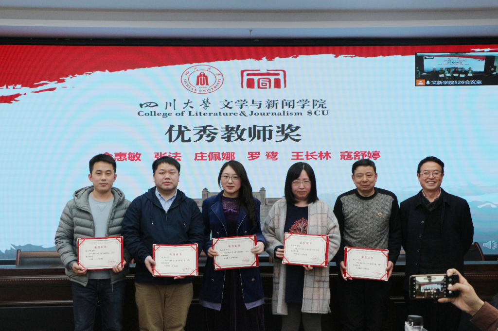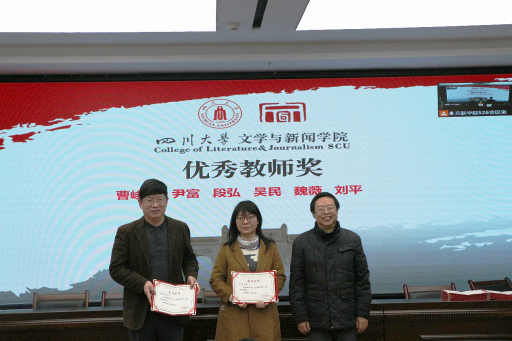 年度工作总结和新学期相关工作布置说明结束后,古立峰书记宣布2021年我院对各项工作表彰的获奖名单并说明了评奖原则。在欢快热烈的音乐中,古立峰书记、李怡院长与学术院长曹顺庆教授共同为我院获奖教职员工颁奖。