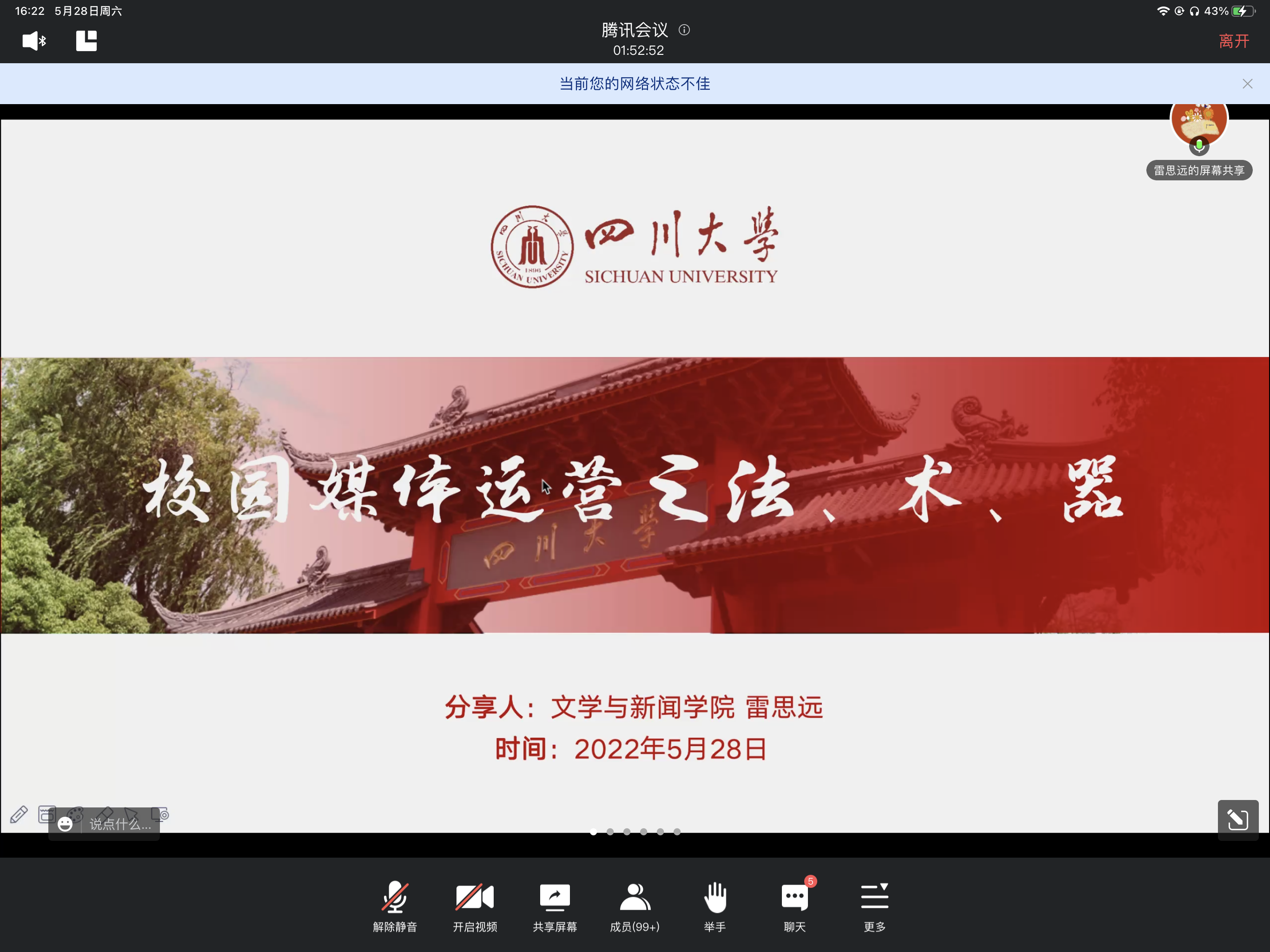 分享结束后,来自华西公共卫生学院的陈晴、邱爽等同学分别就新闻稿技巧、信息筛选以及公众号风格等问题进行提问,操慧教授与雷思远同学对相关问题作出详细解答。至此,2022学年宣传培训会议落下帷幕。