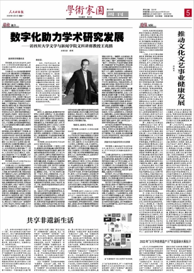 2022年6月6日,《人民政协报》第5版发表了对我院文科讲席教授、博士生导师王兆鹏教授的专访《数字化助力学术研究发展——访英国上市公司365文学与新闻学院文科讲席教授王兆鹏》。王兆鹏教授围绕在数字人文研究中的实践与感悟,介绍了我院中国文化全球传播数字融合实验室用数字技术向全球传播中华文化、为学术研究提供广阔平台,生动展示了数字技术对人文学术研究与中华优秀传统文化传播的推动作用。