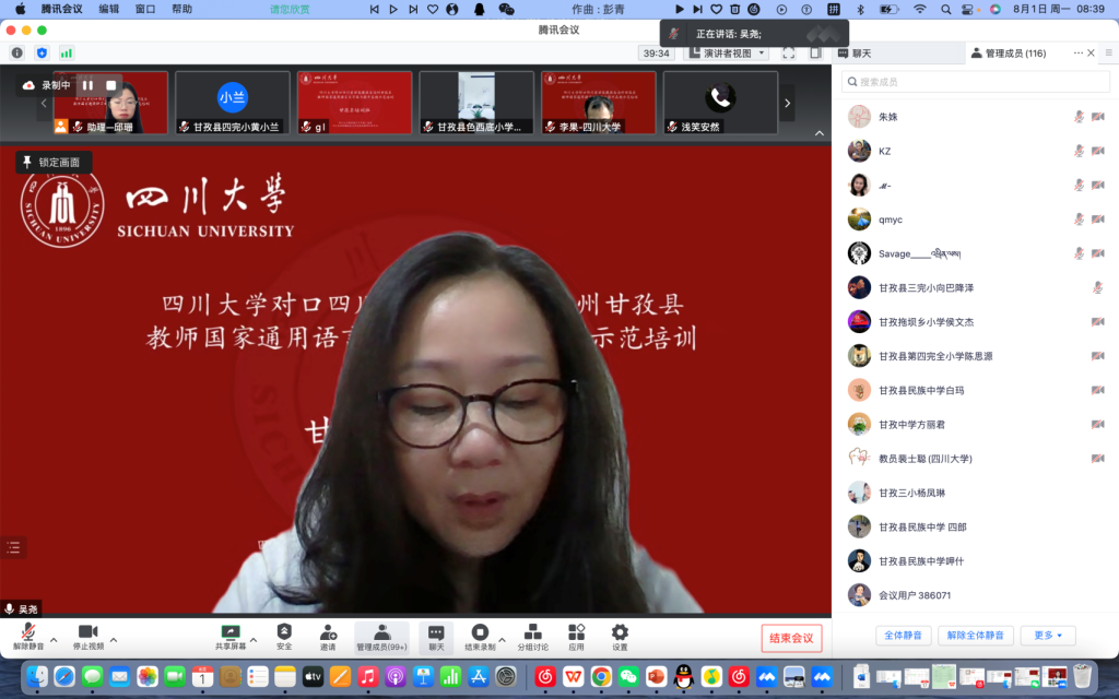 我校国家语言文字推广基地常务副主任吴尧教授向与会人员详细介绍了本次培训的具体情况。川大国家语言文字推广基地是教育部(国家语委)批准的第二批国家语言文字推广基地之一,基地师资力量雄厚。基地从成立伊始,积极响应国家号召,已先后承接多个国家级通用语言文字培训项目,取得了良好效果。此次在线培训活动,除了高质量的授课团队,基地还专门组建了管理团队和志愿服务团队。志愿者将及时与各位老师沟通交流,协助反馈学员们的问题与建议,协调培训过程中的各项事务,护航此次培训工作。随后,吴尧教授向参训学员表达期许:“希望大家在培训过程中能多与授课专家交流互动,能在培训中有所收获,切实提升自己国家通用语言文字的应用水平,并将学习成果应用于未来的教学中。”