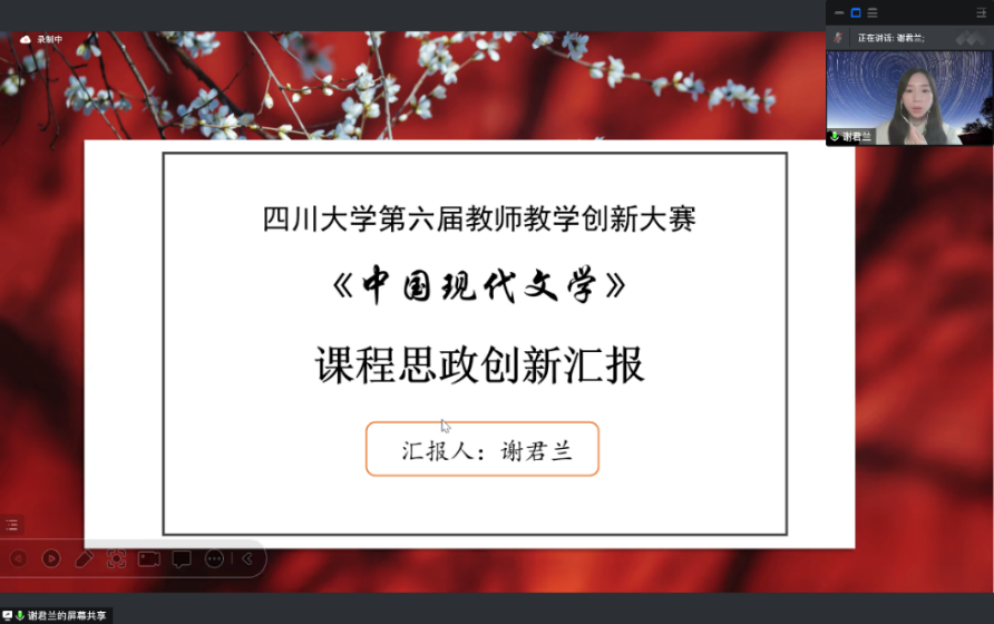 谢君兰副教授、宋耀研究员、戴路副研究员、李扬老师、赵心竹老师等5位参赛教师依照分组顺序进行15分钟的在线试讲。试讲部分由说课和微课两个环节组成,参赛的5位老师不仅从宏观角度阐释了课程设计、教学理念等要素;而且在有限时间内进行了模拟教学演示,凸显了教学创新、课程思政、学术内涵等亮点。