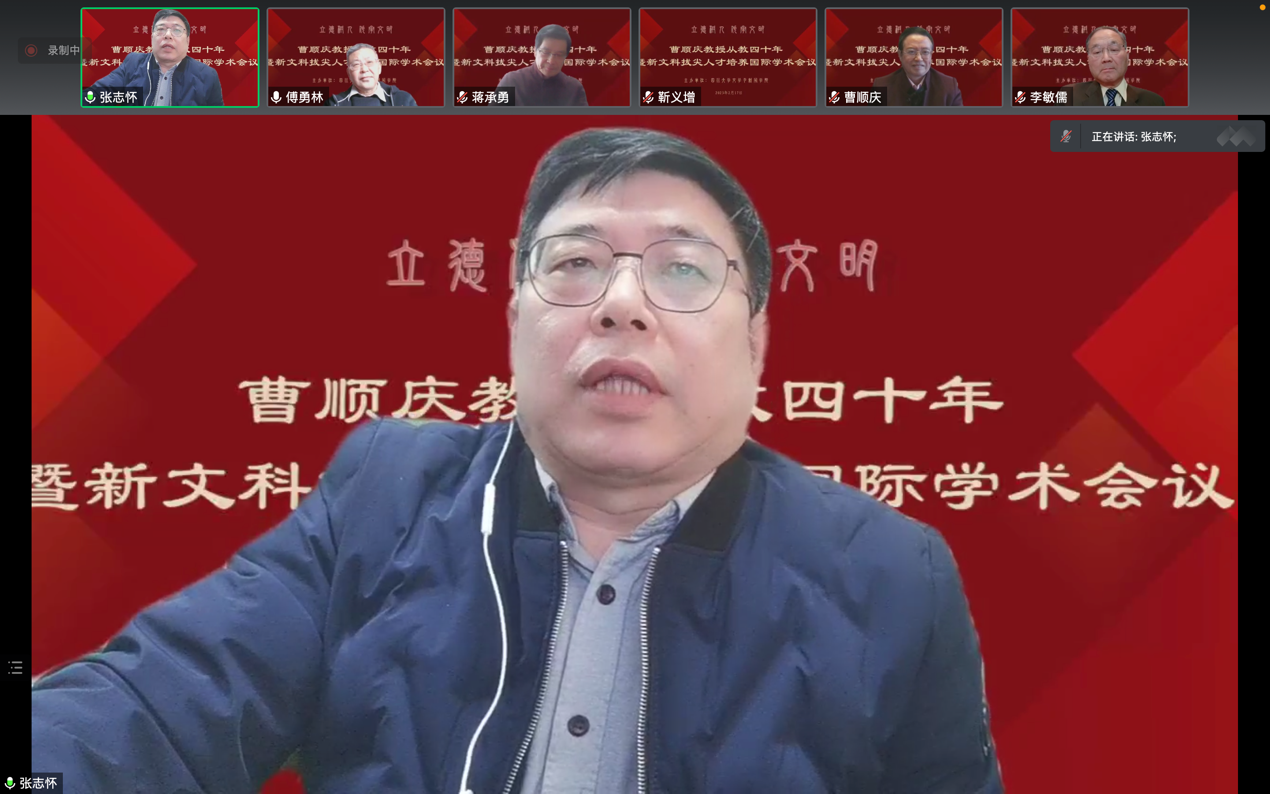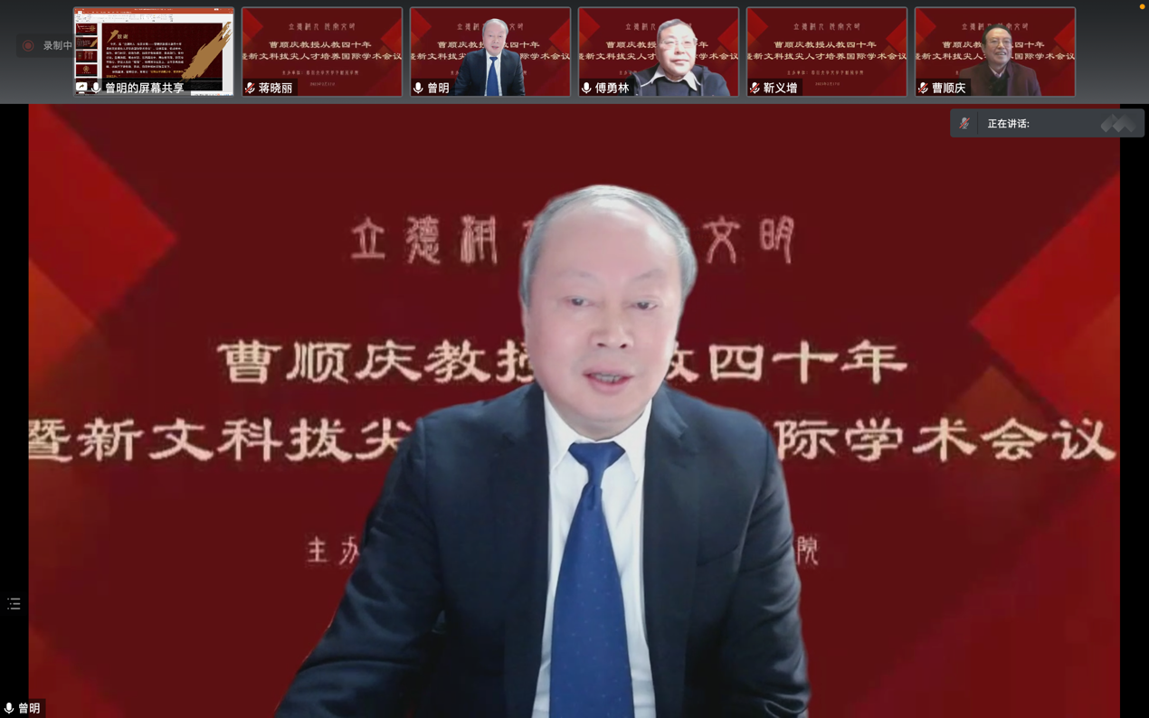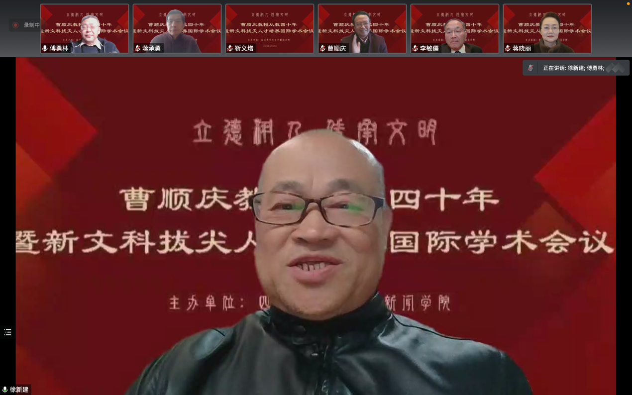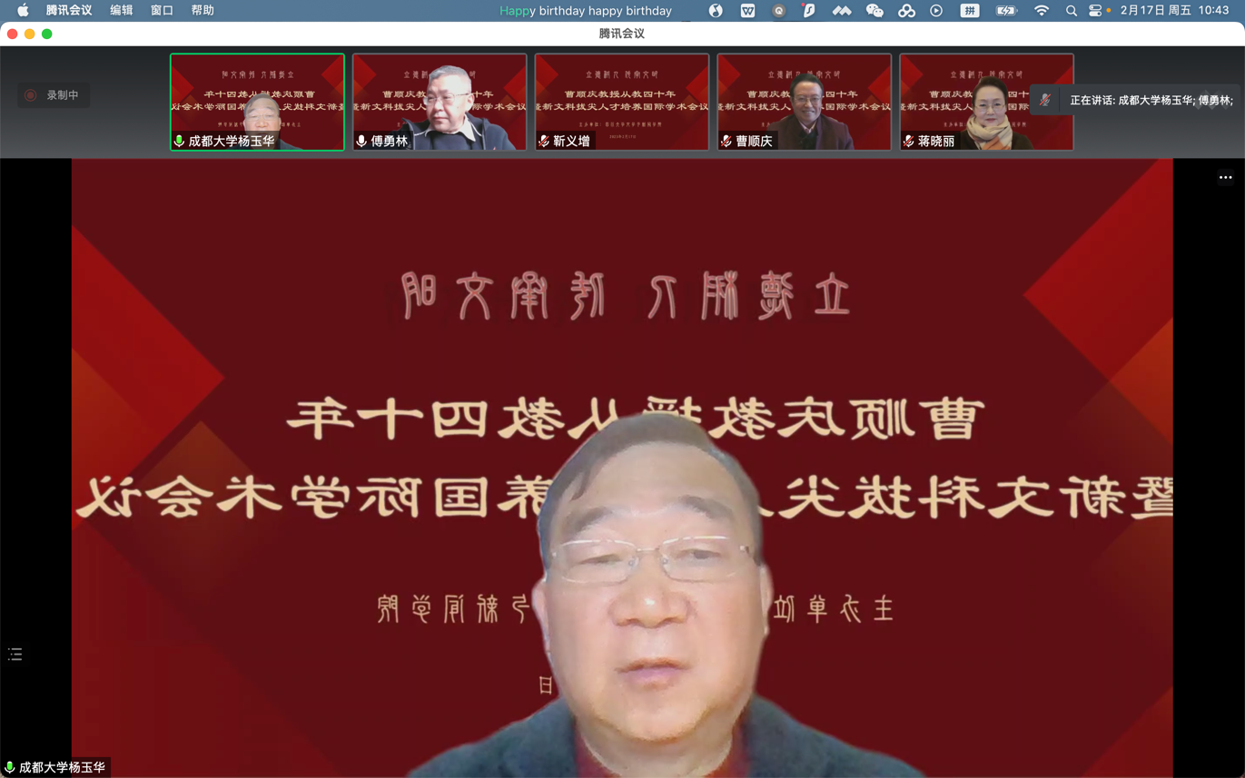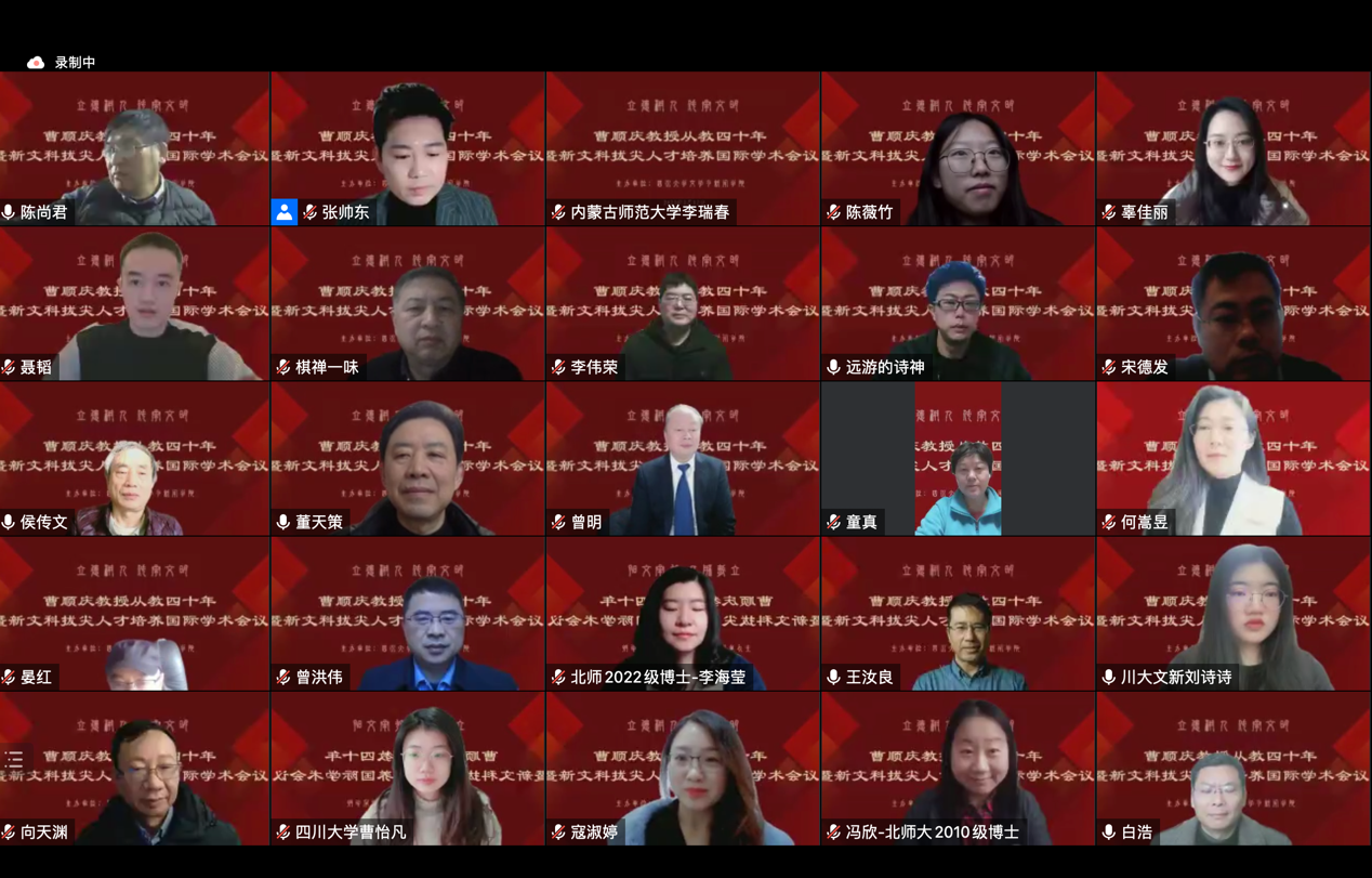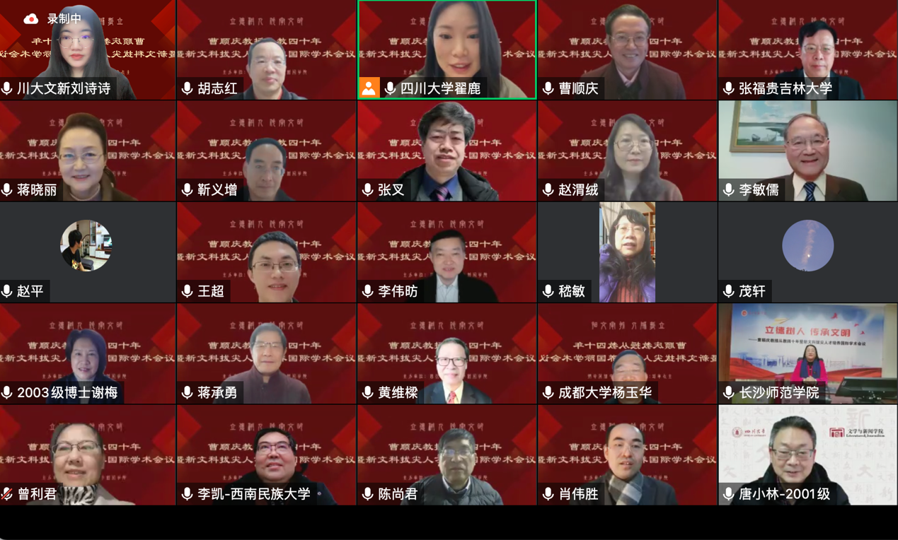 2023年2月17日,由我院主办的“立德树人 传承文明——曹顺庆教授从教四十年暨新文科拔尖人才培养”国际学术会议在云端顺利举行,来自法国索邦大学、美国俄亥俄州立大学、越南胡志明市国家大学、香港中文大学、中国社会科学院、北京师范大学、北京外国语大学、中央民族大学、首都师范大学、吉林大学、复旦大学、上海交通大学、浙江大学、浙江师范大学、浙江工商大学、河南大学、湖南大学、湘潭大学、长沙师范学院、华中科技大学、广西大学、暨南大学、电子科技大学、成都大学、四川外国语大学、四川师范大学、西南大学、西南交通大学、西南民族大学、重庆师范大学、重庆大学、贵州师范大学、西北民族大学、英国上市公司365等海内外近四十所高校的300余位学者参与会议。