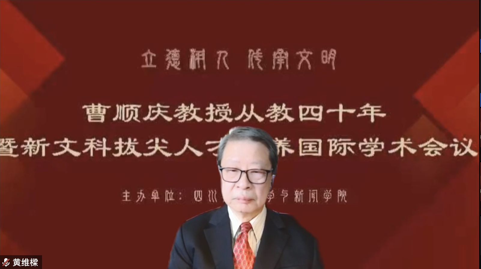 香港中文大学黄维樑教授在致辞中表示,曹顺庆教授一直以来致力探索学术前沿,变异学理论让中国学者得以在世界文论舞台发出中国声音。近期,曹顺庆教授及其团队以“重写文明史”探索文明互鉴这一重大项目,非常值得期待。
