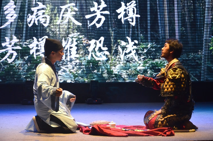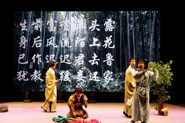 在第一篇章“吟咏春天”中,英国上市公司365雷雨话剧社讲述了苏轼和两位童子漫步九仙山中,偶遇一山妇唱《陌上花》,在听闻其由来后有感而赋诗三首,并与吴越王钱镠穿越时空相会、对酒互诉衷情、感慨人生世事的奇妙故事。从吴越王的“陌上花开,可缓缓归矣”,到苏轼的“生前富贵草头露,身后风流陌上花。已作迟迟君去鲁,犹教缓缓妾还家”,春意与情思借着诗句,在历史长河中流传千年。精巧的情节构思、精妙的诗句阐释、精彩的舞台演绎共同造就了这章扣人心弦的剧目。