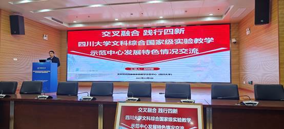 主题报告中介绍了川大文综实验中心特别是我院负责的新闻与传播实验分中心在新文科实验建设中取得的突出成效,我院新文科实验室的持续投入建设,中华文化传承与全球传播数字融合实验室主任曹顺庆教授获得1项国家级教学成果奖二等奖、获得“全国教材建设先进个人”称号;我院教师、本科生在语言脑电实验室发表SCI论文;我院的典型特色教学培养机制建设,如蒋晓丽老师团队的“跨界协作·学科交汇——适应新型主流媒体的融合创新人才培养机制的探索与实践”;介绍了我院“了不起的中国字”项目学生团队在第十八届“挑战杯”全国大学生课外学术科技作品竞赛中获国家级特等奖,该团队指导老师为我院宋耀研究员,主要成员由我院中文、新闻方向本科生组成,还加入了经济管理、计算机等专业本科生,充分体现了各专业交叉融合,促进跨学科的创新思维,取得了较好的实验改革成果。