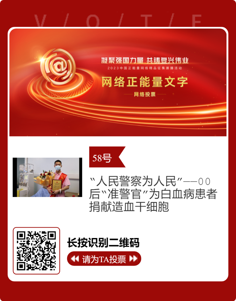 近日,由中央网信办主办的2023中国正能量网络精品征集展播活动正式启动网络展播投票。我院报送的四川省红十字会作品《“人民警察为人民”——00后“准警官”为白血病患者捐献造血干细胞》成功入围终选,进入网络展播投票阶段,时间为2月27日至3月4日,投票结果将作为中国正能量网络精品终选的重要参考。