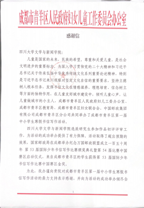 11月26日,成都市青羊区人民政府妇女儿童工作委员会办公室向我院发来感谢信,感谢我院对青羊区第一届中小学生寒假书信写作活动的的支持,同时向我院操慧教授、研究生辅导员雷子慧老师,研究生朱明、罗浩然、徐卓群、雷振宇同学致以诚挚的谢意。