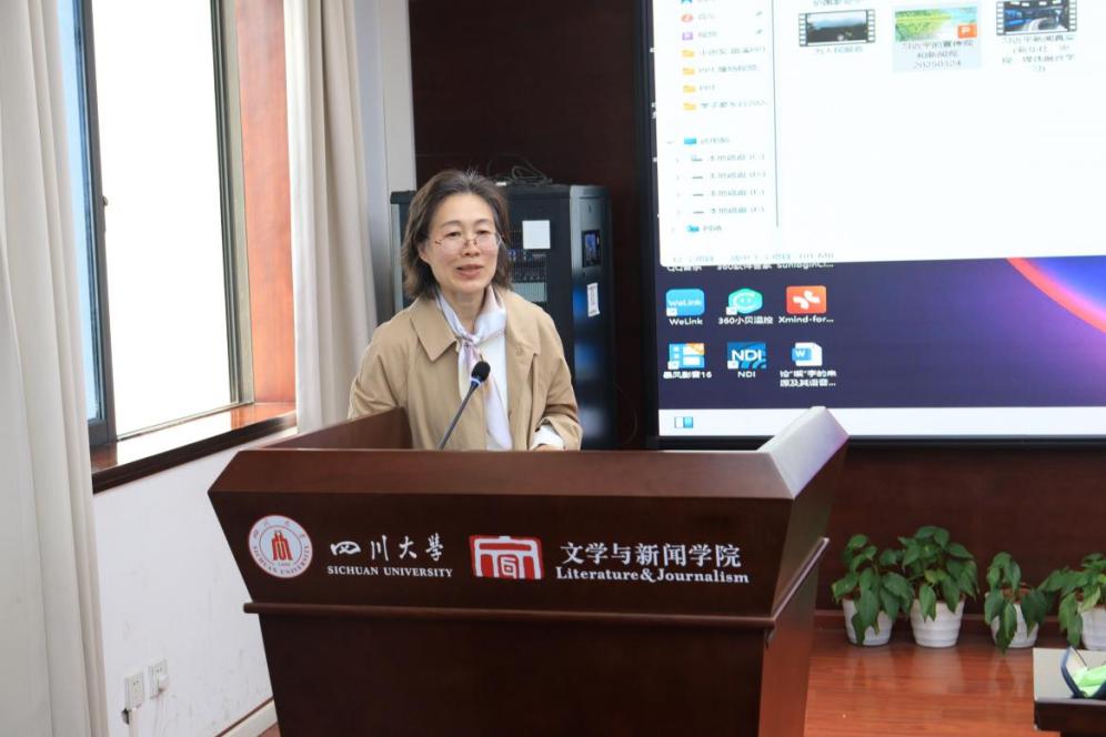 四川省第九批高校与新闻单位从业人员互聘交流入选者、在我院挂职的四川日报首席编辑简霞结合自身从业经历,分享了马克思主义新闻观指导下的新闻实践。她表示“新闻无小事”,“从业越久越需谨慎”,并结合近期编采案例反思新闻文风问题。她说:“改进文风,是新闻媒体的常课。”她强调落实“转作风、改文风”要求,践行“短实新”、反对“长空假”,并通过深入基层捕捉鲜活素材的重要性和必要性。