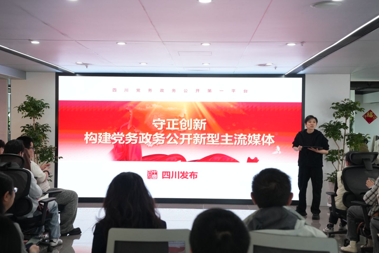 座谈伊始,我院副院长操慧教授作为“媒体融合报道案例丛书”及本书主编,聚焦四川发布作为全国省级政务新媒体标杆的实践经验,向与会师生系统介绍了四川发布从传播矩阵搭建到引领媒体融合创新的十余年发展路径。“该书是我院与四川发布进行产学研合作的结晶,旨在打通学界研究与行业前沿联结的双向通道,我院研究生团队参与了所有典型案例的评析写作,在过程中完成了学习、思考、借鉴等专业实践”,她说,“今天我们来到现场,延伸课堂教学,增强了对新闻发布与新媒体政务创新的感性认知,是大家融入新闻课程思政的沉浸体验”。