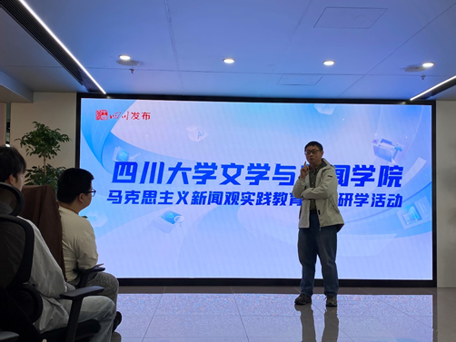 4月11日下午,我院30余名师生前往四川新闻大厦,开启2025年马克思主义新闻观学习教育实践首站活动。我院副院长操慧教授、新闻学教研室主任骆世查副教授与2024级辅导员朱至刚教授及学院本科、硕士及博士生代表参加了本次活动。