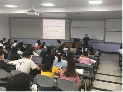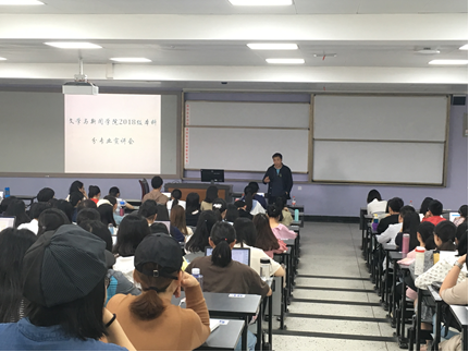 为了贯彻学院办学理念,实现专业人才培养目标,5月10日下午,学院就专业分流相关事宜分别向中国语言文学类和新闻传播学类的2018级本科生进行了宣讲。学院党委副书记张莹老师、文艺学教研室主任阎嘉教授、语言学与汉语国际教育教研室主任李宇凤副教授、广播电视学教研室李宜蓬老师、广告学与符号学教研室主任饶广祥副教授、传播学与新媒体教研室主任张悦副教授、编辑出版学教研室曾元祥副教授出席了本次宣讲会。宣讲会由2018级本科生辅导员杨珊老师主持。此外,新闻学教研室主任陈雪奇教授和部分教师在教师休息日里,已就专业分流问题进行了解答。
