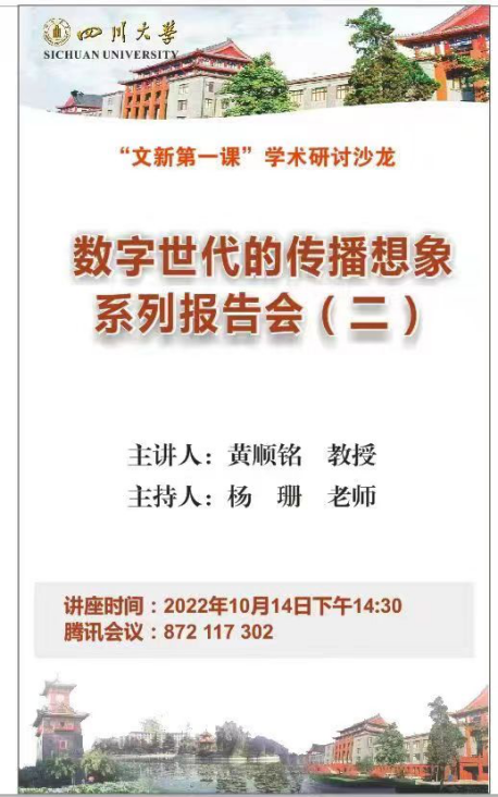 11月4日,我院新闻学教研室黄顺铭教授为2022级本科新生举办的线上系列报告会《数字世代的传播想象》圆满落幕。自9月14日起,报告会已成功举办三场,每场邀请4组来自《大众传播学研究》课程的研究生分享论文。该系列报告会由我院2022级本科新生辅导员杨姗老师主持。