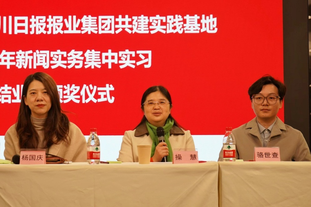11月11日,我院与四川日报报业集团共建实践基地2024年新闻实务集中实习结业暨颁奖仪式在四川传媒大厦演播厅举行。四川日报报业集团传媒研究中心副主任兼《新闻界》副总编辑杨国庆、我院副院长操慧教授、骆世查副研究员、张诚副研究员、马烨老师、付若岚老师出席仪式,现场为优秀实习生颁发荣誉证书。