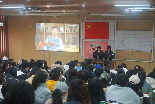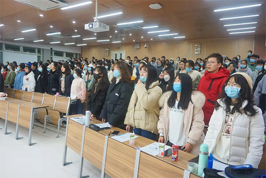 同学们全部就坐后,主持人宣布我院2021-2022学年团校第三次行课正式开始并介绍到场嘉宾。在同学们《中国共青团团歌》的嘹亮歌声中,本次团校行课正式拉开序幕。