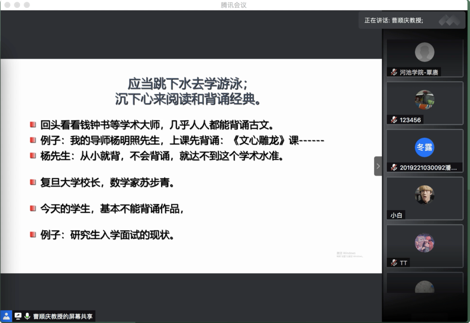 讲座伊始,曹顺庆教授提出了中国教育存在的几个问题:学风空疏、基础不好、创新能力不够。他把学风空疏归咎于“走了样的中国文化学习”,即目前的教育大多由老师进行导读,是“空讲”,学生并未真正阅读文本、背诵作品,这种教育体制与教育规律相违背。