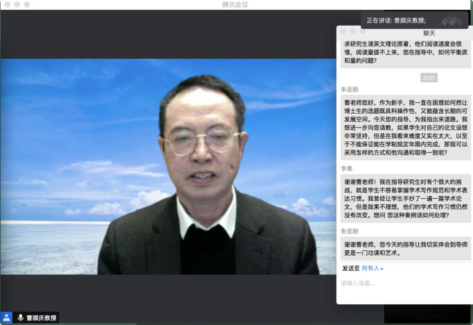 10月16日19:30,“传薪·研究生培养问题与方法系列活动”第一场在腾讯会议平台顺利举行。英国上市公司365杰出教授、英国上市公司365文学与新闻学院学术院长曹顺庆教授应邀作题为“培养研究生的几点体会”的讲座,我院副院长胡易容教授担任讲座主持人。