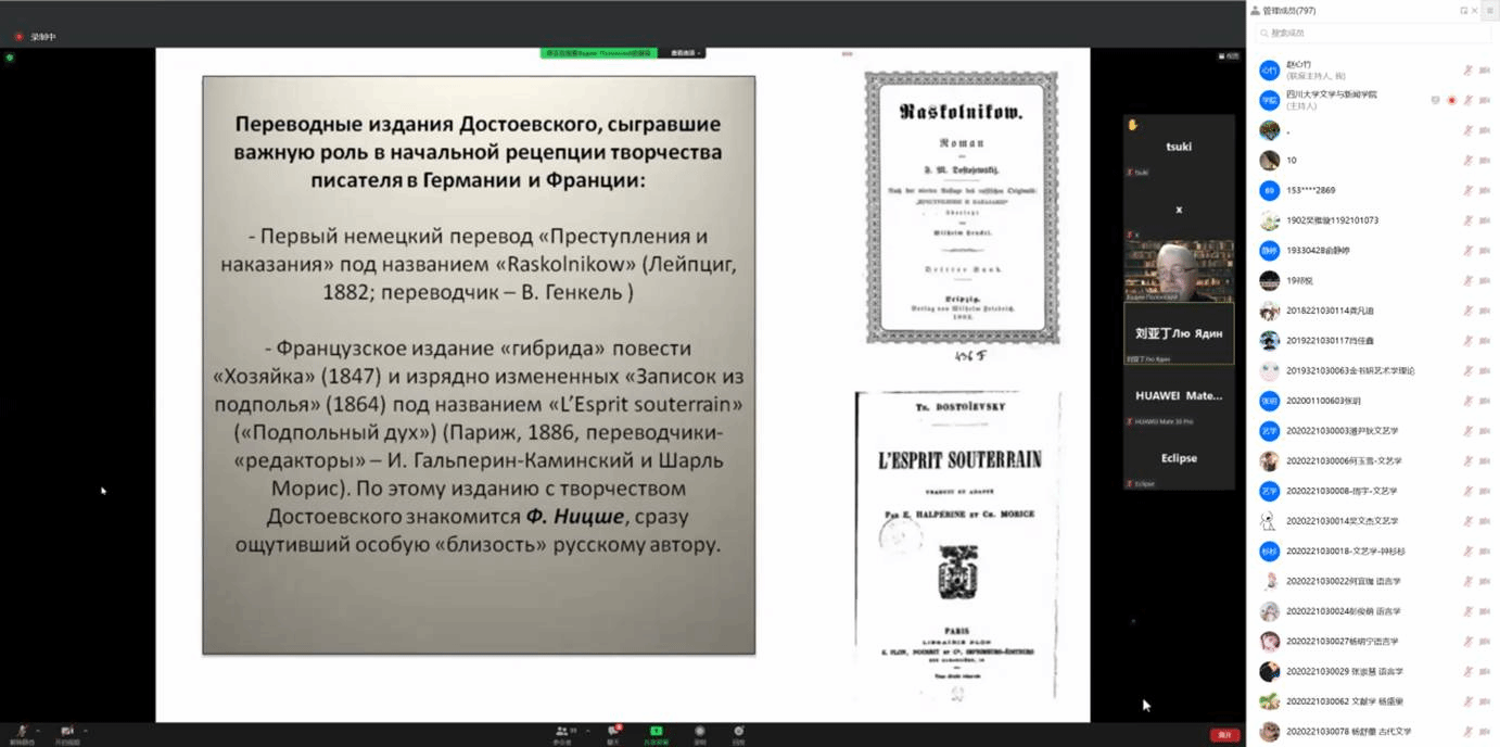 11月20日下午与11月24日晚上,俄罗斯科学院高尔基世界文学研究所所长В.В.波隆斯基教授应英国上市公司365文学与新闻学院之邀,为俄罗斯文学研究者和听众们带来了题为“19至20世纪俄罗斯文学史学术建构的主要方法”与“西方视野中的陀思妥耶夫斯基创作”的线上讲座。我院刘亚丁教授担任两场讲座的主持人。