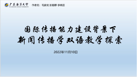 广东海洋大学新闻传播系学生李晓芸以《国际传播能力建设背景下新闻传播学双语教学探索》为题作了报告。她指出,高等教育承担着为地方经济、文化发展服务的功能。通过选用原版英文教材实施双语教学,有利于在原著语境中准确把握新闻传播学理念。另外,双语教学可在一定程度上引入国外的新观点、新方法、新成果,有利于支持“一带一路”发展。最后,她分别从课程设置、教学模式、条件支撑、调查研究等方面,对新闻传播学双语教学实践进行了说明与论证。