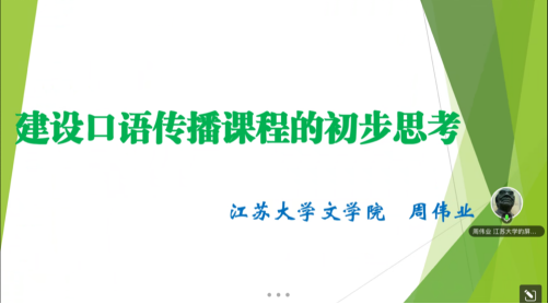 江苏大学文学院教授周伟业作了名为《建设口语传播课程的初步思考》的主题报告。首先,他引用了当前自媒体时代频频出现的口语传播案例,指出口语传播的影响力已日益凸显。接着,他指出,口语传播建设基础良好、历史悠久,渗透在各行各业当中,且已有相关理论著作以及相应的研究流派。最后,他围绕如何建设口语传播课程,提出了自己的初步思考,包括口语传播是否应该进入高校、如何走进高校课程建设体系等。