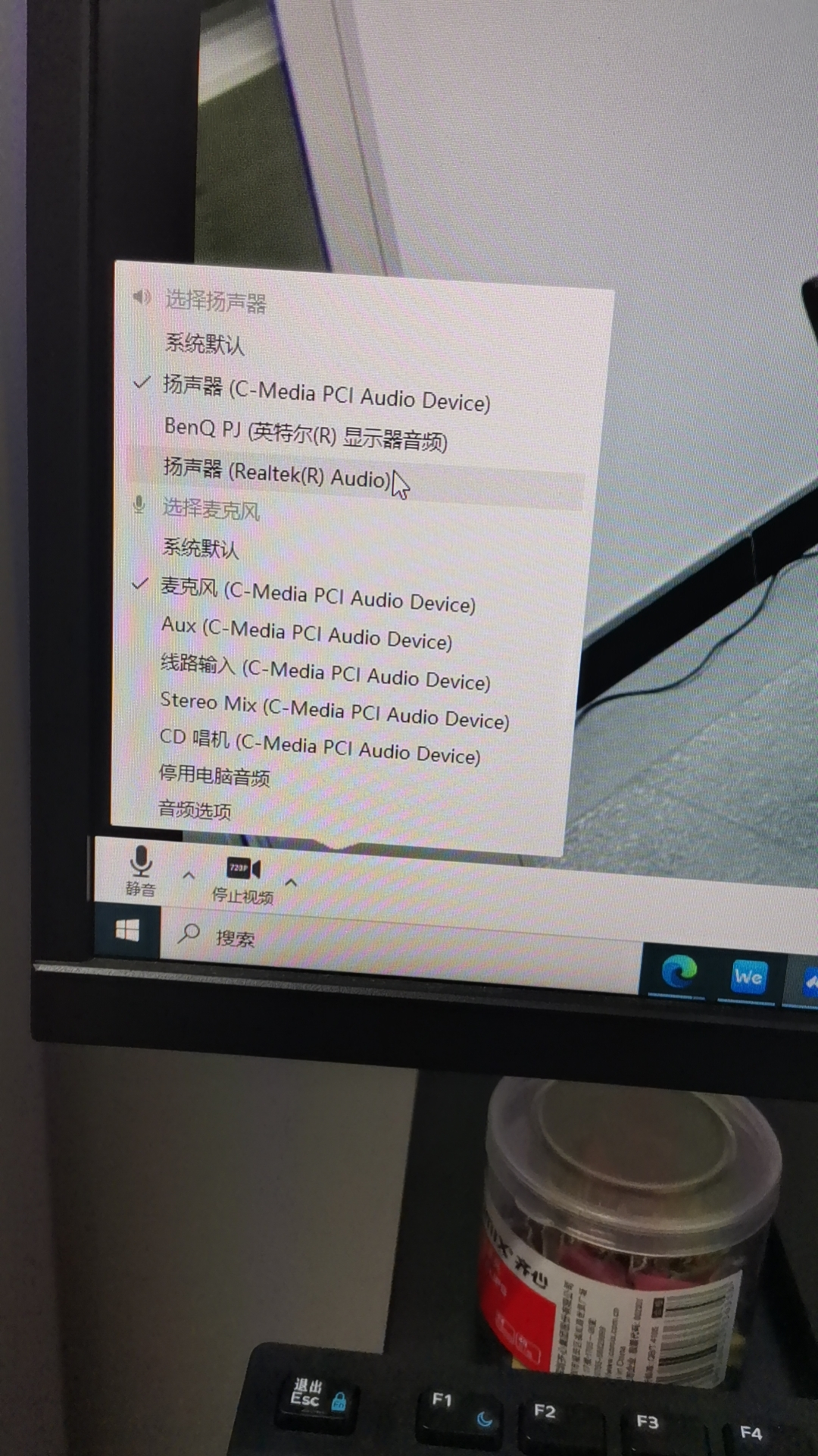 请注意:在视频会议软件中选择如下打钩处的音频设备,才可以正常发音和收音。