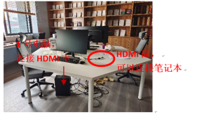 机柜处的台式电脑主机连接了视频会议用的摄像头和调音台,如果需要进行视频会议,请使用机柜处的台式电脑。